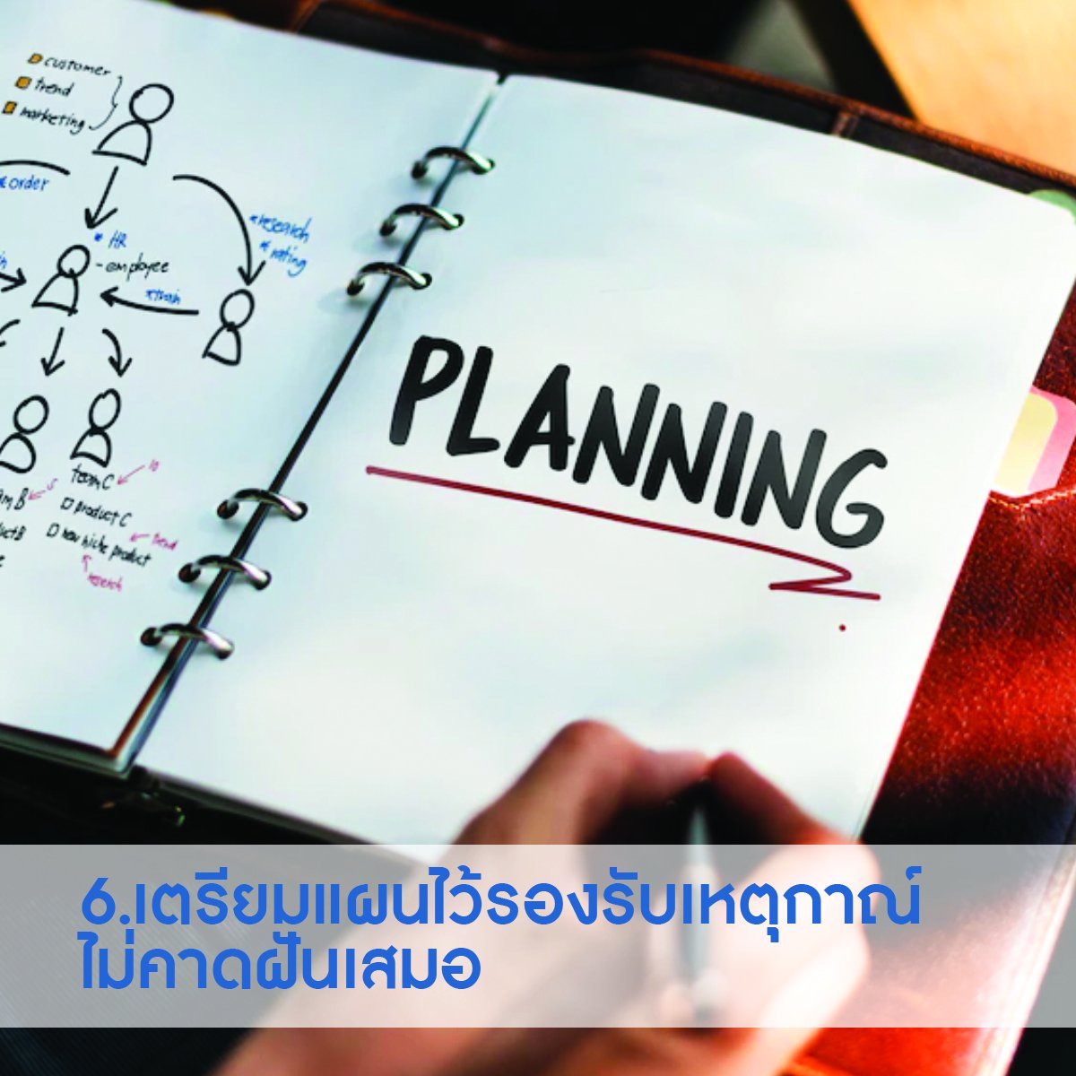 •6.เตรียมแผนไว้รองรับเหตุกาณ์ไม่คาดฝันเสมอ ควรมีแผนสำรองในกรณีฉุกเฉิน รวมถึงมีการทำงานอย่างยืดหยุ่น สามารถปรับเปลี่ยนได้ตามสถานการณ์ที่เกิดขึ้นเฉพาะหน้า
